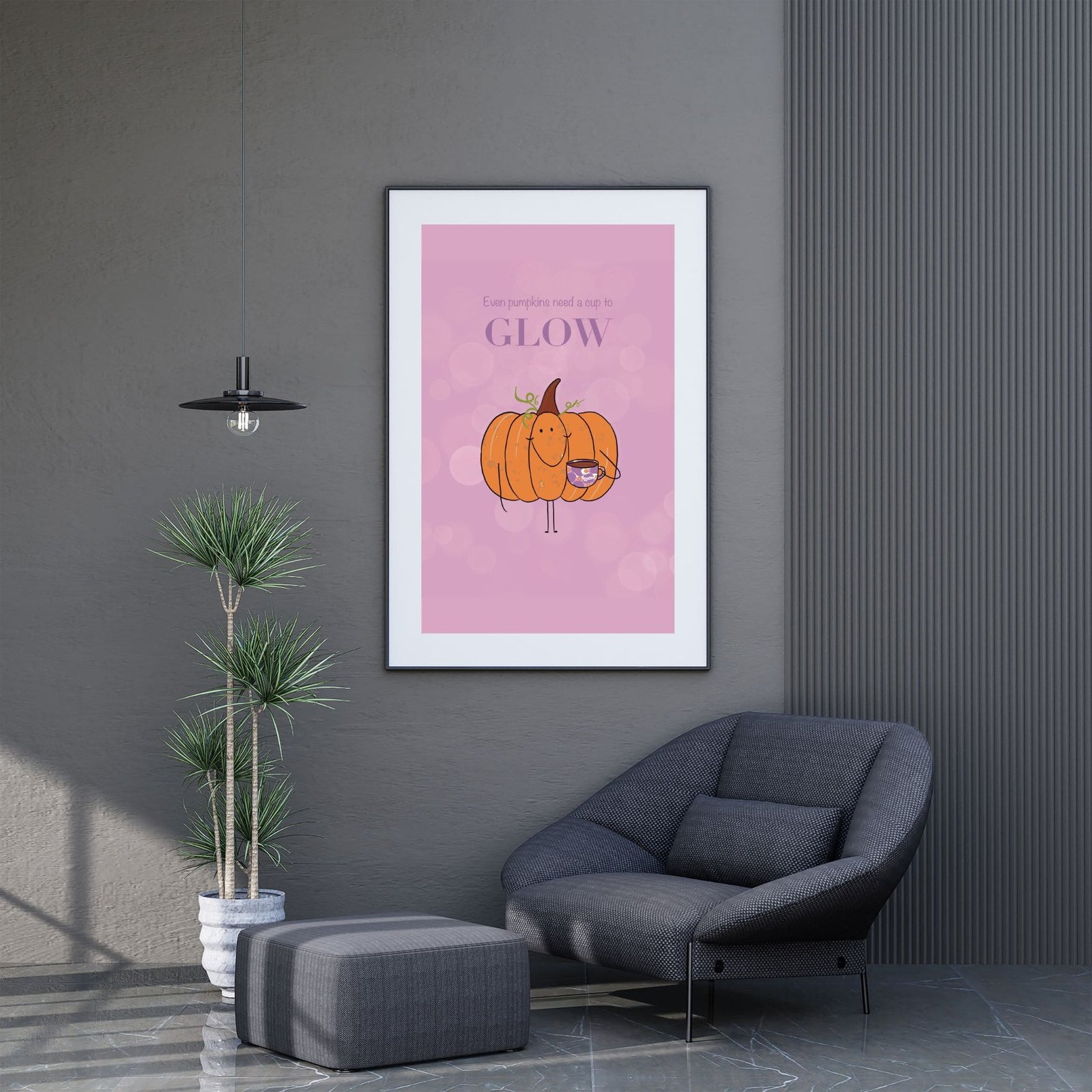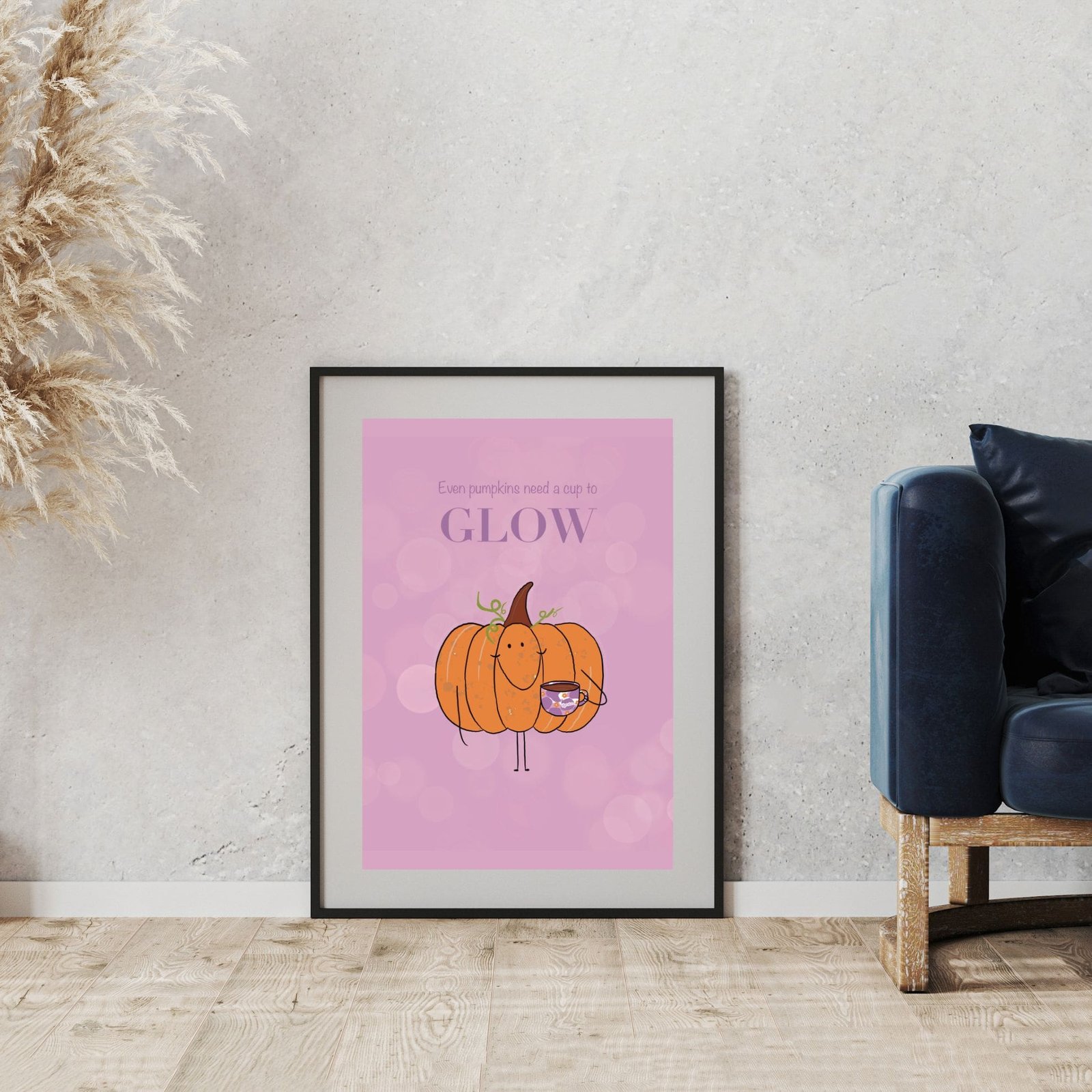 Bring cozy autumn vibes and a touch of humor to your home with Glowing Pumpkin print. This cheerful illustration shows a smiling pumpkin holding a cup that says “Every pumpkin needs a cup to glow.” It’s a playful reminder that even pumpkins need a little coffee to shine.